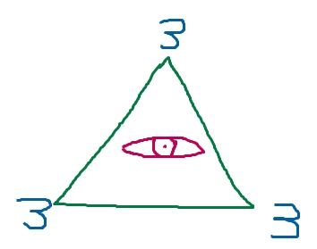 The all seeing eye exists on 3 planes (mind, body, and soul) and covers all 360 degrees of existance.. each plane equalling 120 degrees while the "3"s located on each corner are 60 degrees of the 180 degree triangle... only 2 corners or totalling 120 degrees can be used to evaluate any thing at any one time. 60 degrees depicting the minds, bodies, and souls ability to 1.)compile 2.)analyze and 3.)react to the data and things around it... each event 120 degrees at a time. Nevermind I'm done b*llsh***ing :)